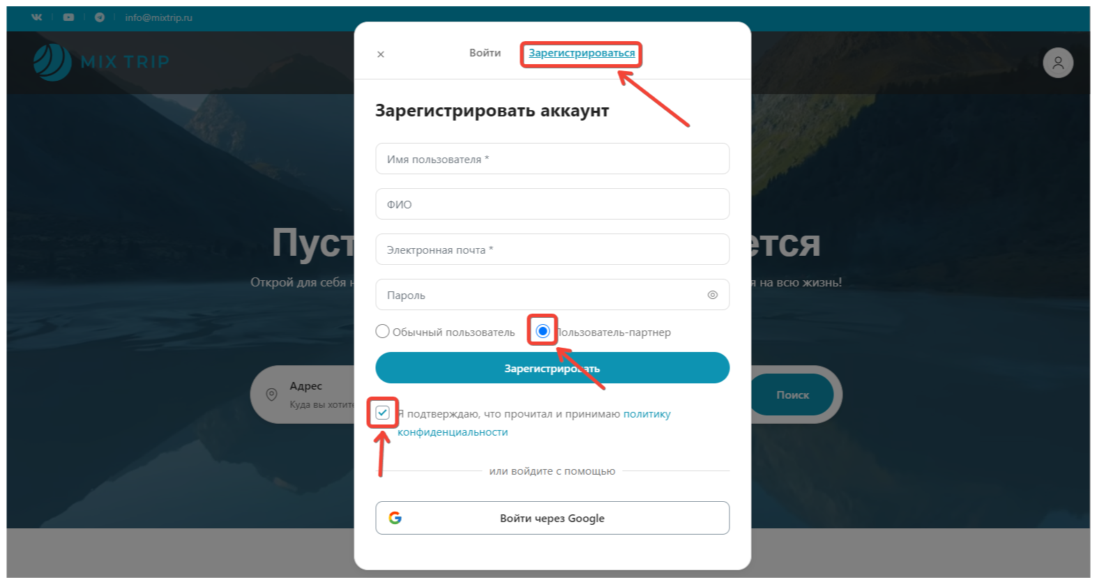 • Регистрируетесь, выбираете отметку пользователь-партнер. Соглашаетесь с политикой конфеденциальности.