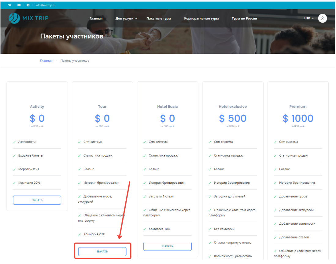 Мы объединяем надежных партнеров и туристов. Вам остаётся только пройти регистрацию и выбрать пакет.