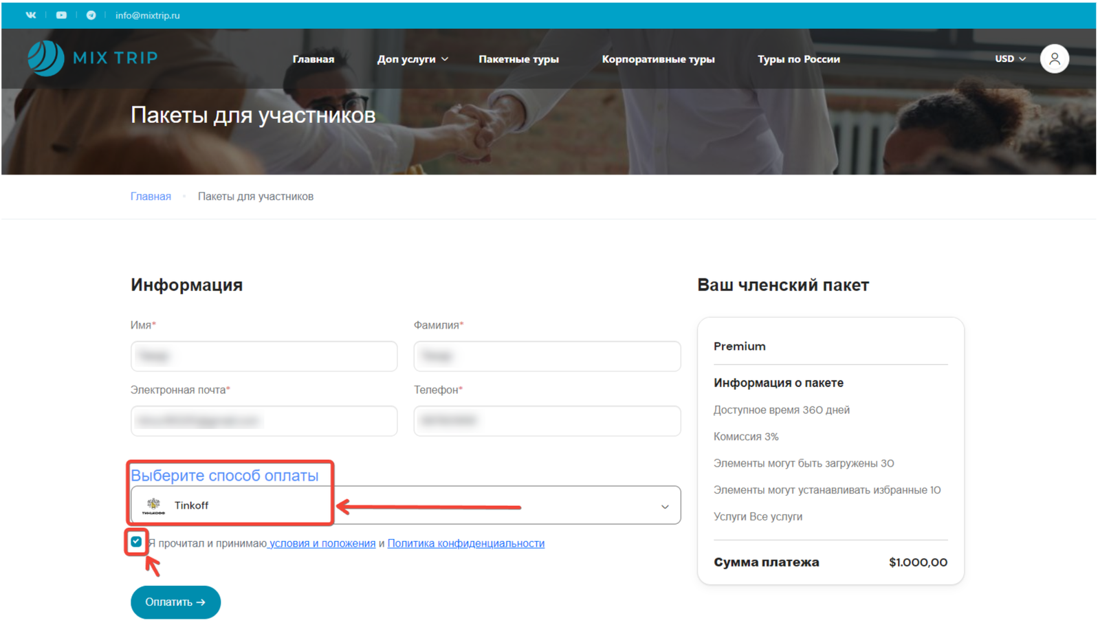 • Далее, выбираете способ оплаты и соглашаетесь с политикой конфиденциальностью.