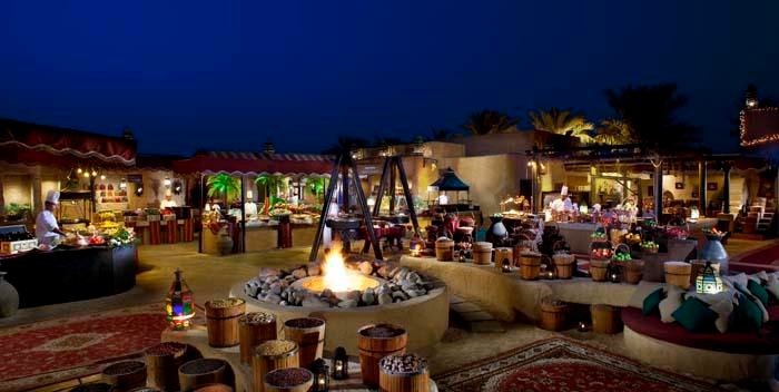 Entdecken Sie das Restaurant in Bab Al Shams Al Hadheerah, das in eine abgelegene Ecke zwischen der arabischen Wüste und dem bodenlosen Nachthimmel lockt. Wenn Sie auf dem östlichen Markt auf eine neue Art spazieren gehen, werden Sie unbemerkt zum Fest der echten nahöstlichen Küche gelangen, wo die Gerichte direkt vor Ihren Augen zubereitet werden. Hier werden Sie mit traditionellen Gerichten aus Fleisch, Meeresfrüchten, heimischem Gemüse und Obst und natürlich den berühmten orientalischen Süßigkeiten verwöhnt.