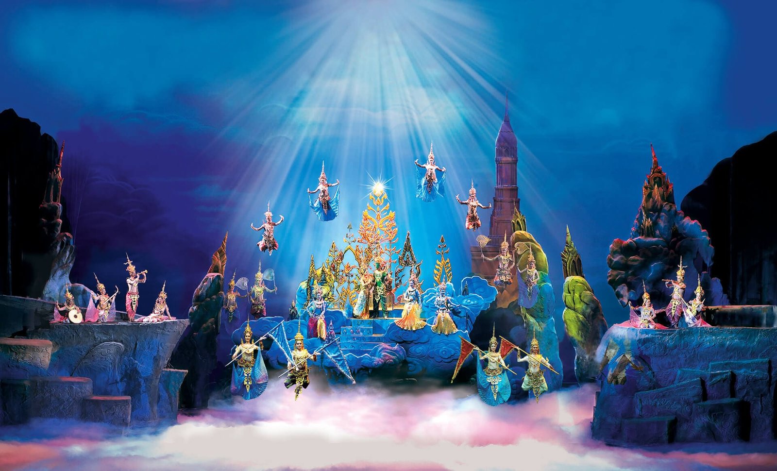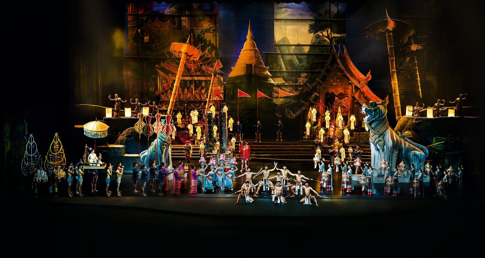 Mehr als 100 verschiedene Szenen, wunderschönes Design und Dekorationen, besondere Liebe zum Detail, über 500 Kostüme, elegant schwebende Engel, ein plötzlicher Fluss auf der Bühne, ein echtes Gewitter mit strömendem Regen, Donner und Blitz und viele andere atemberaubende Spezialeffekte erwarten Sie in einer dynamischen Darstellung, die Sie mit den thailändischen Traditionen und dem kulturellen Erbe des Königreichs vertraut macht.